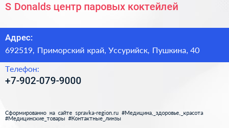 S.Donalds, центр паровых коктейлей по адресу 692519, Приморский край, Уссурийск, Пушкина, 40 в дальнейшем Организация, размещена в следующих категориях: