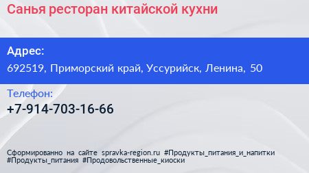 Санья, ресторан китайской кухни по адресу 692519, Приморский край, Уссурийск, Ленина, 50 в дальнейшем Организация, размещена в следующих категориях: