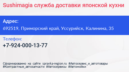 Sushimagia, служба доставки японской кухни по адресу 692519, Приморский край, Уссурийск, Калинина, 35 в дальнейшем Организация, размещена в следующих категориях: