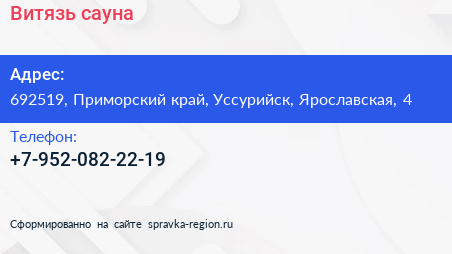 Витязь, сауна по адресу 692519, Приморский край, Уссурийск, Ярославская, 4 в дальнейшем Организация, размещена в следующих категориях: