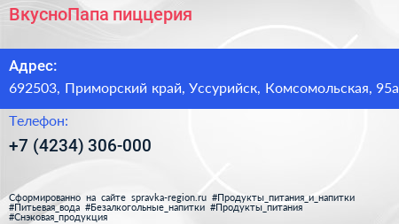 ВкусноПапа, пиццерия по адресу 692503, Приморский край, Уссурийск, Комсомольская, 95а в дальнейшем Организация, размещена в следующих категориях: