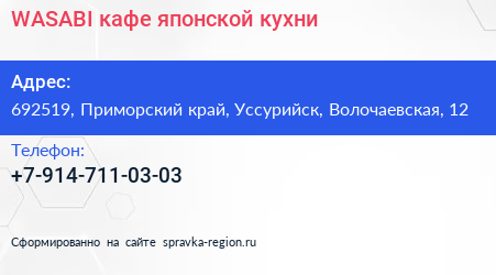 WASABI, кафе японской кухни по адресу 692519, Приморский край, Уссурийск, Волочаевская, 12 в дальнейшем Организация, размещена в следующих категориях: