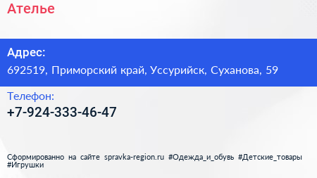 Ателье по адресу 692519, Приморский край, Уссурийск, Суханова, 59 в дальнейшем Организация, размещена в следующих категориях: