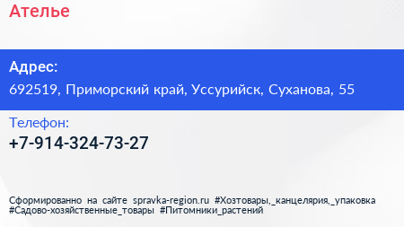 Ателье по адресу 692519, Приморский край, Уссурийск, Суханова, 55 в дальнейшем Организация, размещена в следующих категориях: