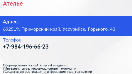 Ателье по адресу 692519, Приморский край, Уссурийск, Горького, 43 в дальнейшем Организация, размещена в следующих категориях: