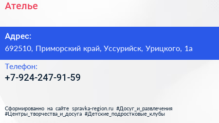 Ателье по адресу 692510, Приморский край, Уссурийск, Урицкого, 1а в дальнейшем Организация, размещена в следующих категориях: