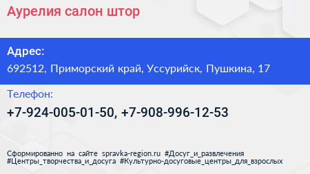 Аурелия, салон штор по адресу 692512, Приморский край, Уссурийск, Пушкина, 17 в дальнейшем Организация, размещена в следующих категориях: