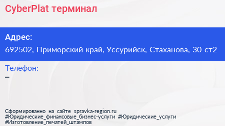 CyberPlat, терминал по адресу 692502, Приморский край, Уссурийск, Стаханова, 30 ст2 в дальнейшем Организация, размещена в следующих категориях: