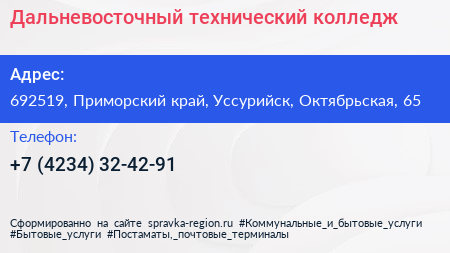 Дальневосточный технический колледж по адресу 692519, Приморский край, Уссурийск, Октябрьская, 65 в дальнейшем Организация, размещена в следующих категориях: