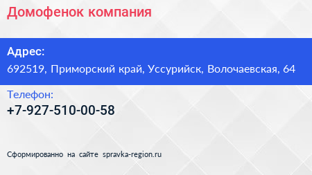 Домофенок, компания по адресу 692519, Приморский край, Уссурийск, Волочаевская, 64 в дальнейшем Организация, размещена в следующих категориях: