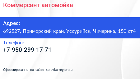 Коммерсант, автомойка по адресу 692527, Приморский край, Уссурийск, Чичерина, 150 ст4 в дальнейшем Организация, размещена в следующих категориях: