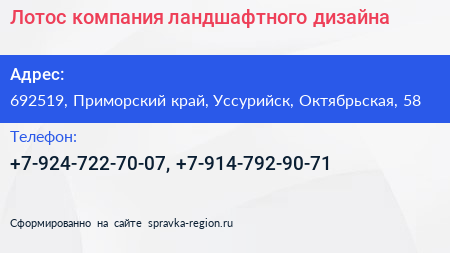 Лотос, компания ландшафтного дизайна по адресу 692519, Приморский край, Уссурийск, Октябрьская, 58 в дальнейшем Организация, размещена в следующих категориях: