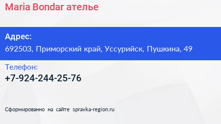 Maria Bondar, ателье по адресу 692503, Приморский край, Уссурийск, Пушкина, 49 в дальнейшем Организация, размещена в следующих категориях: