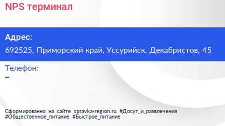 NPS, терминал по адресу 692525, Приморский край, Уссурийск, Декабристов, 45 в дальнейшем Организация, размещена в следующих категориях:
