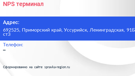 NPS, терминал по адресу 692525, Приморский край, Уссурийск, Ленинградская, 91Б ст3 в дальнейшем Организация, размещена в следующих категориях: