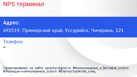 NPS, терминал по адресу 692519, Приморский край, Уссурийск, Чичерина, 121 в дальнейшем Организация, размещена в следующих категориях: