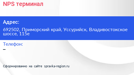 NPS, терминал по адресу 692502, Приморский край, Уссурийск, Владивостокское шоссе, 115е в дальнейшем Организация, размещена в следующих категориях: