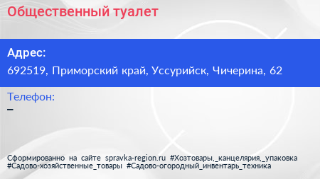 Общественный туалет по адресу 692519, Приморский край, Уссурийск, Чичерина, 62 в дальнейшем Организация, размещена в следующих категориях: