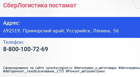 СберЛогистика, постамат по адресу 692519, Приморский край, Уссурийск, Ленина, 56 в дальнейшем Организация, размещена в следующих категориях: