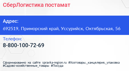 СберЛогистика, постамат по адресу 692519, Приморский край, Уссурийск, Октябрьская, 56 в дальнейшем Организация, размещена в следующих категориях: