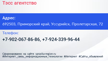 Тэсс, агентство по адресу 692503, Приморский край, Уссурийск, Пролетарская, 72 в дальнейшем Организация, размещена в следующих категориях:
