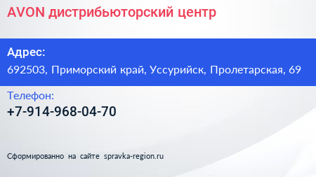 AVON, дистрибьюторский центр по адресу 692503, Приморский край, Уссурийск, Пролетарская, 69 в дальнейшем Организация, размещена в следующих категориях: