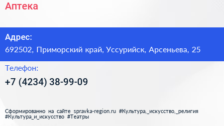 Аптека по адресу 692502, Приморский край, Уссурийск, Арсеньева, 25 в дальнейшем Организация, размещена в следующих категориях: