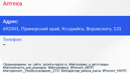 Аптека по адресу 692501, Приморский край, Уссурийск, Воровского, 131 в дальнейшем Организация, размещена в следующих категориях: