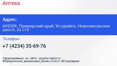 Аптека по адресу 692509, Приморский край, Уссурийск, Новоникольское шоссе, 2а ст3 в дальнейшем Организация, размещена в следующих категориях: