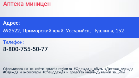 Аптека миницен по адресу 692522, Приморский край, Уссурийск, Пушкина, 152 в дальнейшем Организация, размещена в следующих категориях: