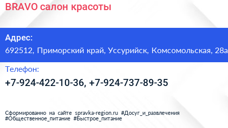 BRAVO, салон красоты по адресу 692512, Приморский край, Уссурийск, Комсомольская, 28а в дальнейшем Организация, размещена в следующих категориях: