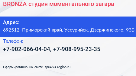 BRONZA, студия моментального загара по адресу 692512, Приморский край, Уссурийск, Дзержинского, 93Б в дальнейшем Организация, размещена в следующих категориях: