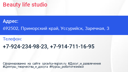 Beauty life studio по адресу 692502, Приморский край, Уссурийск, Заречная, 3 в дальнейшем Организация, размещена в следующих категориях: