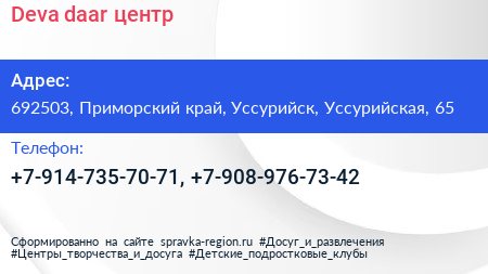 Deva daar, центр по адресу 692503, Приморский край, Уссурийск, Уссурийская, 65 в дальнейшем Организация, размещена в следующих категориях: