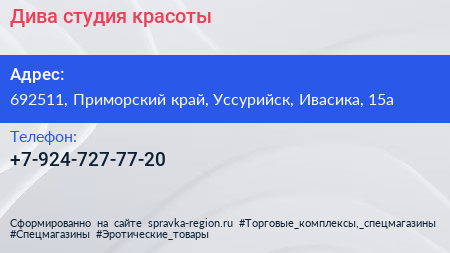 Дива, студия красоты по адресу 692511, Приморский край, Уссурийск, Ивасика, 15а в дальнейшем Организация, размещена в следующих категориях: