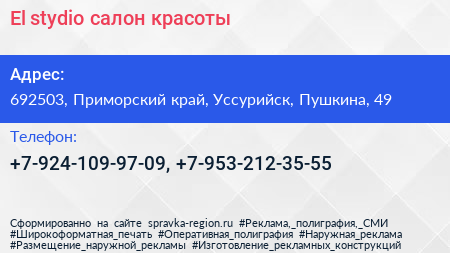 El stydio, салон красоты по адресу 692503, Приморский край, Уссурийск, Пушкина, 49 в дальнейшем Организация, размещена в следующих категориях: