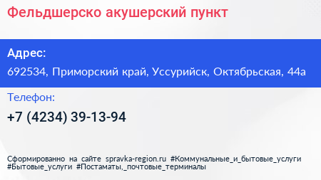 Фельдшерско-акушерский пункт по адресу 692534, Приморский край, Уссурийск, Октябрьская, 44а в дальнейшем Организация, размещена в следующих категориях: