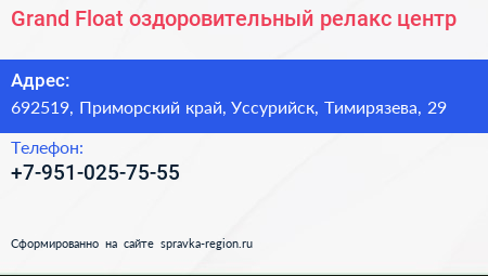 Grand Float, оздоровительный релакс-центр по адресу 692519, Приморский край, Уссурийск, Тимирязева, 29 в дальнейшем Организация, размещена в следующих категориях: