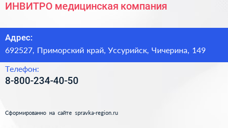ИНВИТРО, медицинская компания по адресу 692527, Приморский край, Уссурийск, Чичерина, 149 в дальнейшем Организация, размещена в следующих категориях: