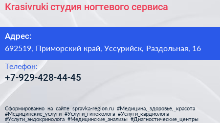 Krasivruki, студия ногтевого сервиса по адресу 692519, Приморский край, Уссурийск, Раздольная, 16 в дальнейшем Организация, размещена в следующих категориях: