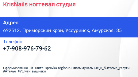 KrisNails, ногтевая студия по адресу 692512, Приморский край, Уссурийск, Амурская, 35 в дальнейшем Организация, размещена в следующих категориях: