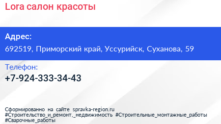 Lora, салон красоты по адресу 692519, Приморский край, Уссурийск, Суханова, 59 в дальнейшем Организация, размещена в следующих категориях: