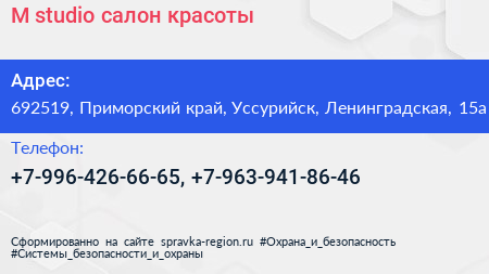 M-studio, салон красоты по адресу 692519, Приморский край, Уссурийск, Ленинградская, 15а в дальнейшем Организация, размещена в следующих категориях: