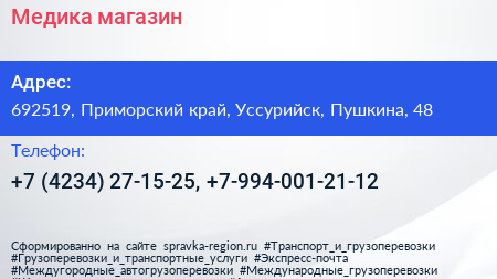Медика, магазин по адресу 692519, Приморский край, Уссурийск, Пушкина, 48 в дальнейшем Организация, размещена в следующих категориях: