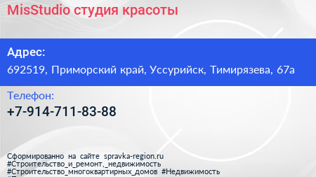 MisStudio, студия красоты по адресу 692519, Приморский край, Уссурийск, Тимирязева, 67а в дальнейшем Организация, размещена в следующих категориях: