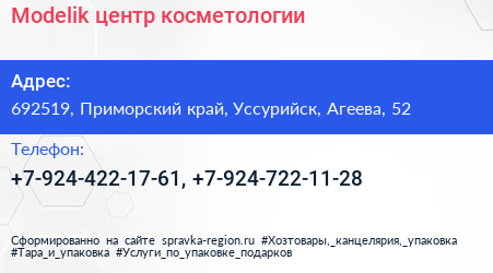 Modelik, центр косметологии по адресу 692519, Приморский край, Уссурийск, Агеева, 52 в дальнейшем Организация, размещена в следующих категориях: