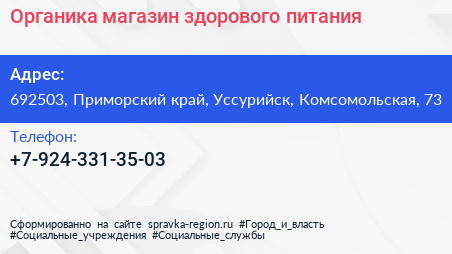 Органика, магазин здорового питания по адресу 692503, Приморский край, Уссурийск, Комсомольская, 73 в дальнейшем Организация, размещена в следующих категориях: