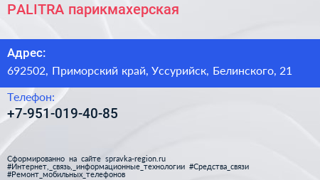 PALITRA, парикмахерская по адресу 692502, Приморский край, Уссурийск, Белинского, 21 в дальнейшем Организация, размещена в следующих категориях:
