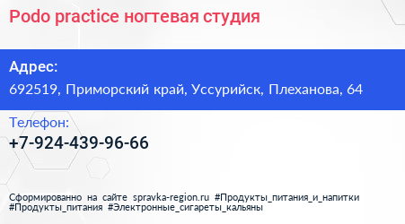 Podo practice, ногтевая студия по адресу 692519, Приморский край, Уссурийск, Плеханова, 64 в дальнейшем Организация, размещена в следующих категориях:
