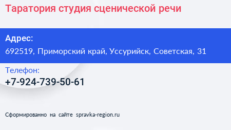 Таратория, студия сценической речи по адресу 692519, Приморский край, Уссурийск, Советская, 31 в дальнейшем Организация, размещена в следующих категориях: